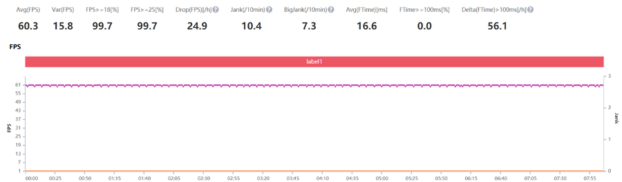 因为《王者荣耀》只支持60帧模式,特效全开的画质设置下,软件记录的平均帧数为60.3帧,游戏全程都能保持很好的流畅度,轻松无压力,这也是意料之中的事。