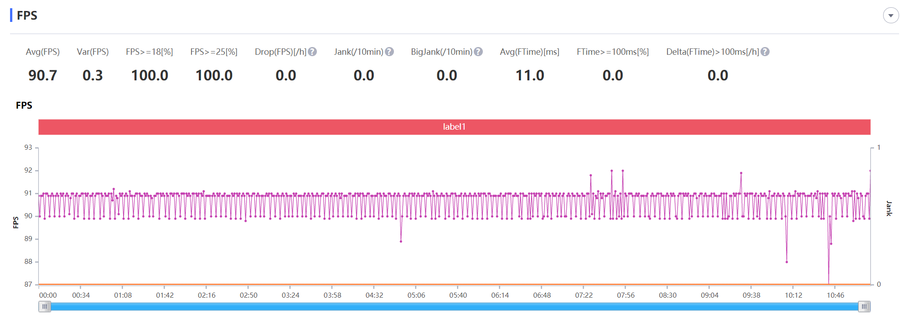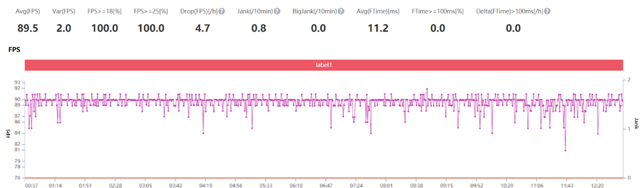 在流畅+90帧+抗锯齿开启的画面设置下,软件记录的平均帧数为89.5帧,在90帧附近有轻微的波动,整体帧数比较稳定,这种小波动在游戏中感知也不大,画面整体流畅度非常好,这种流畅是普通60帧模式所达不到的。
