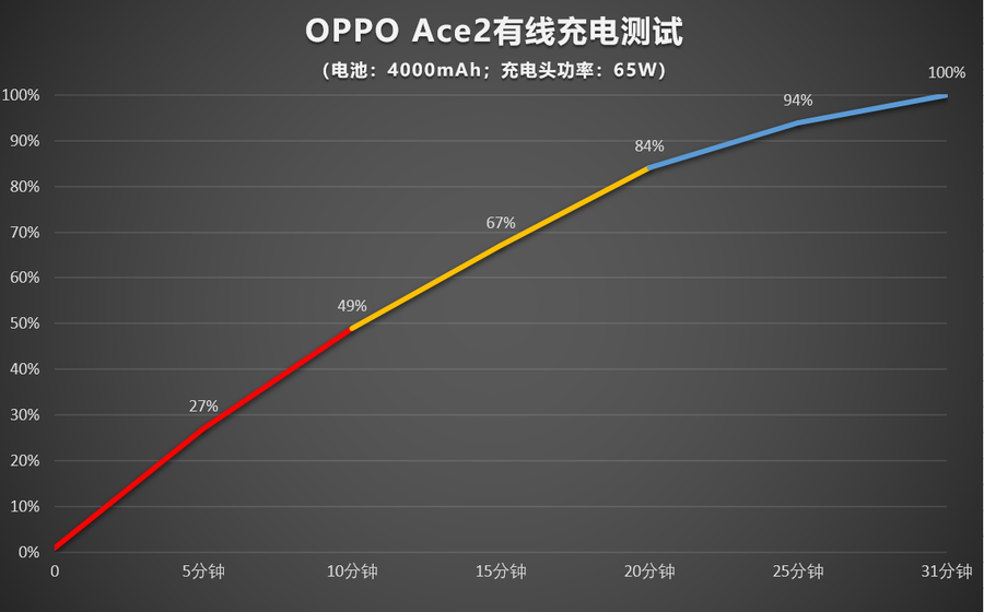 OPPO Ace2所搭载的65W有线超级闪充在去年Reno Ace上先发时就收获了不少关注度,带来的全新充电体验收获了不少用户的认可。在手机电量只剩1%的时候,我们使用原装充电器进行充电测试,实际结果如下。