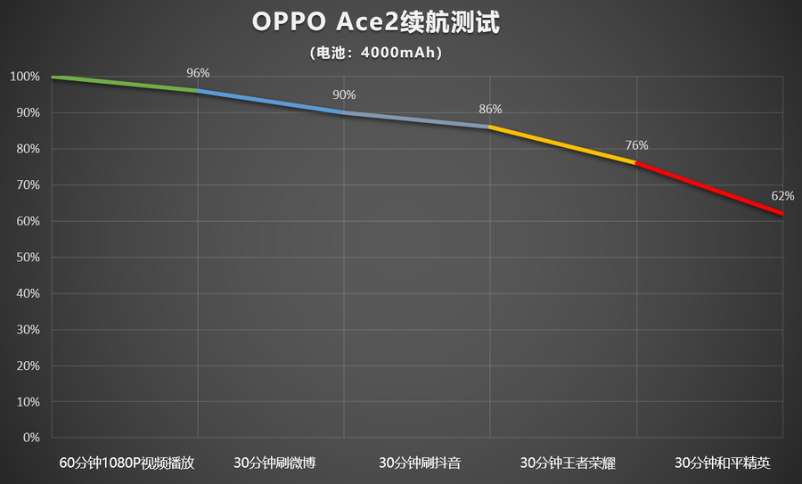 续航测试结果如上图,在线观看1小时1080P视频耗电4%、玩游戏一个小时耗电24%、半小时微博耗电6%、半小时抖音为4%,经过3个小时的续航测试,最终剩余电量为62%,实际续航表现还是挺不错的。OPPO Ace2所配备的超快双闪充还能够有效降低续航焦虑,低电量的时候充电几分钟就能保持较长的续航时间,不用时刻担心手机电量问题。