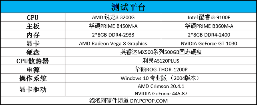 此次测试的CPU性能部分,笔者为AMD锐龙3 3200G处理器找的对手为Intel酷睿i3-9100F。显卡性能部分,笔者为AMD锐龙3 3200G处理器找的对手为NVIDIA GeForce GT 1030。