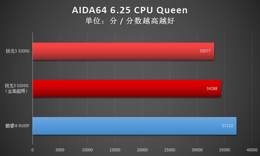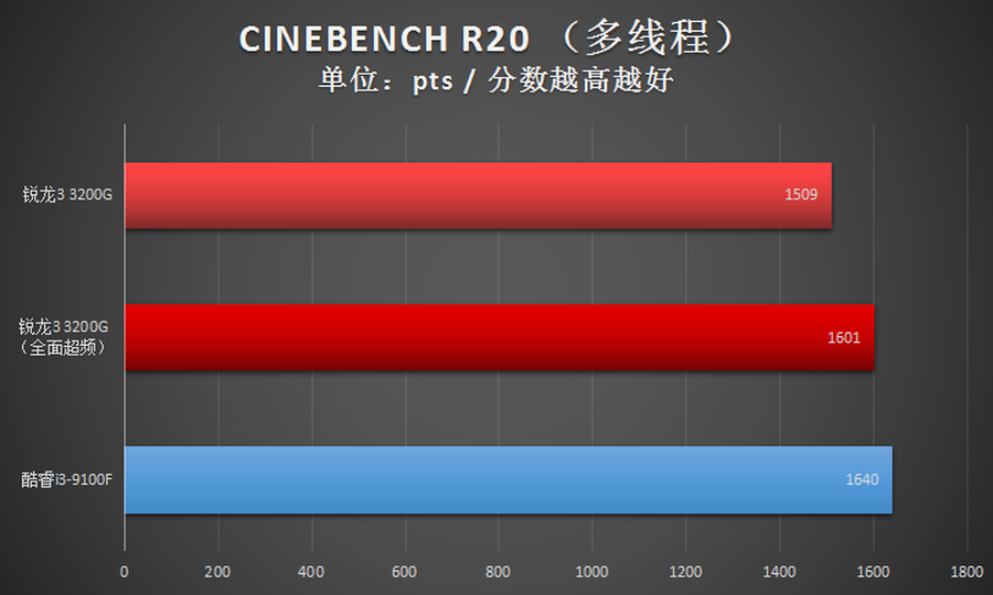 此项目,全面超频之后的AMD锐龙3 3200G处理器在全核心性能方面与Intel酷睿i3-9100F基本一致。