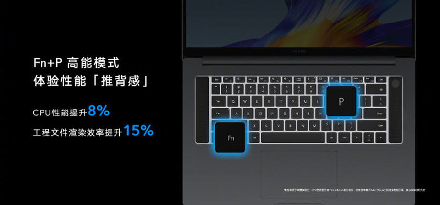 荣耀MagicBook Pro 2020还带来了全新的高能模式,通过Fn+P可以开启高能模式,根据官方介绍,这种模式下CPU性能可以提升8%,工程文件渲染效率提升15%。