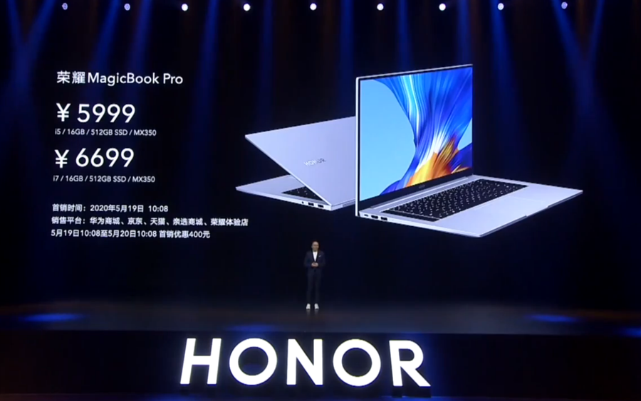 此次发布的荣耀MagicBook Pro 2020共有两款,i5+16GB内存+512GB SSD+MX350独立显卡版本售价5999元,i7+16GB内存+512GB SSD+MX350独立显卡版本售价6699元,首销时间为5月19日10:08。在5月19日10:08至5月20日10:08期间可享受首销优惠400元。