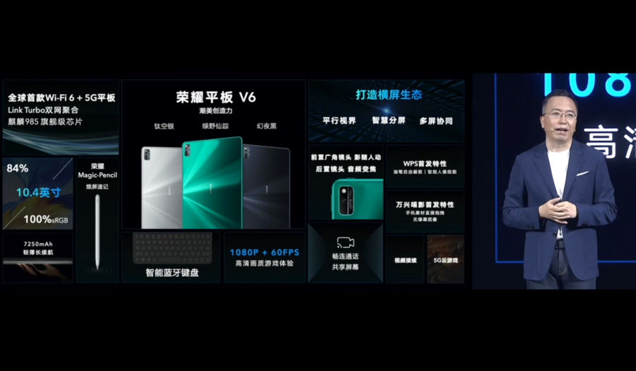 这次荣耀给我们带来了全新的荣耀平板V6,配备10.4英寸2K全面屏,屏占比达到84%,100% sRGB高色域,470nits亮度。外观部分提供绿野仙踪、钛空银、幻夜黑三种配色可选。