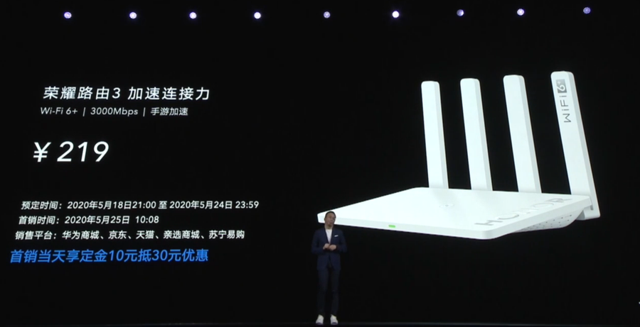 荣耀路由3售价219元,目前已经开启预定,5月25日正式首销,首销当天可享受定金10元抵30元的优惠。