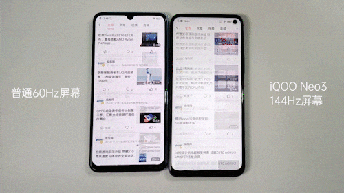 虽然目前采用高刷新率的手机并不少,但只有少数游戏手机才达到144Hz的刷新率,90Hz、120Hz更为常见一些。iQOO Neo3直接采用了144Hz超高刷新率屏幕,相比普通屏幕,每秒钟可以显示更多画面,带来更好的画面流畅度和连贯性。