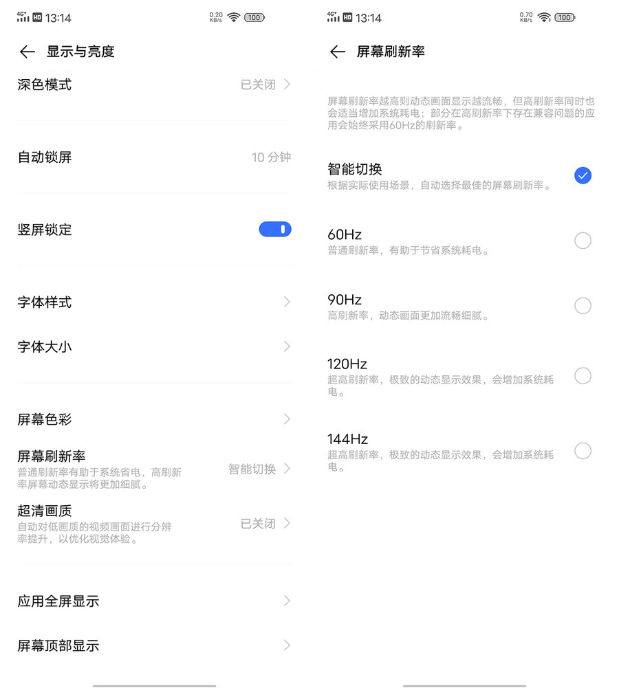 考虑到续航,系统提供了智能切换、60Hz、90Hz、120Hz以及高144Hz四种刷新率模式供选择,可以根据自己喜好选择不同模式。智能切换模式在兼顾流畅的同时,也能带来更好的续航表现。