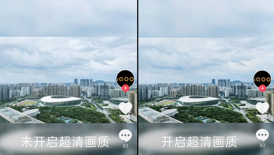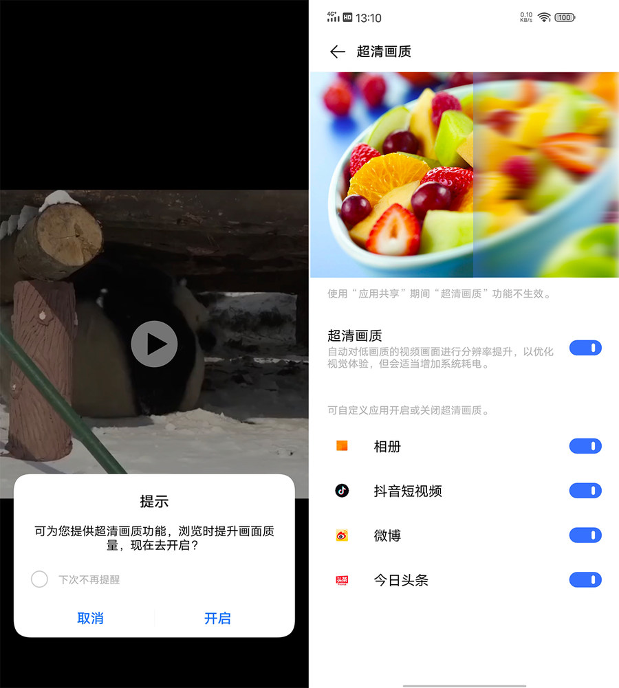 从实际体验看,开启超清画质功能后,视频对比度有所提升,色彩更浓厚一些,画面细节更丰富,可以带来不一样的视频观看体验,从上面对比图可以看到这项功能带来的画面变化。目前该功能支持系统相册、抖音、斗鱼、虎牙、微博、今日头条等第三方APP。