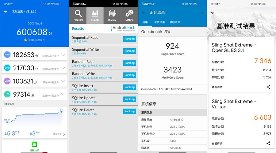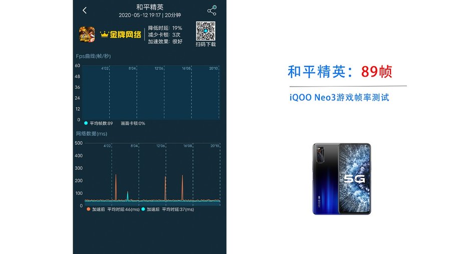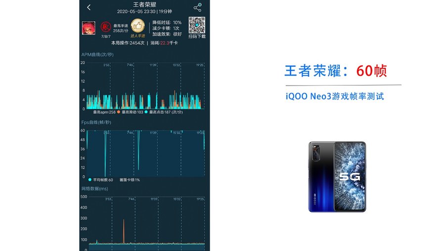 iQOO Neo3的安兔兔跑分高达60万+,综合得分排名很靠前。存储方面读写表现基本与跟iQOO 3一致。游戏方面,我们选取了《王者荣耀》、《和平精英》这两款主流游戏进行测试,并且通过软件记录游戏帧数。