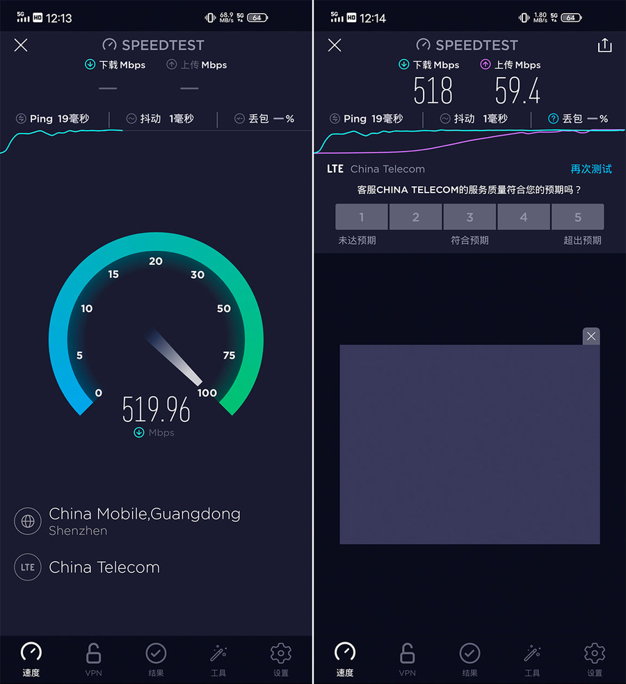 根据实际测试,iQOO Neo3在5G网络下可以轻松达到518Mbps的下载速度(5G套餐限制在500Mbps),59.4Mbps的上传速度。如果不是套餐限制,还会有更快的速度,实际速度已经比4G有相当大的提升。
