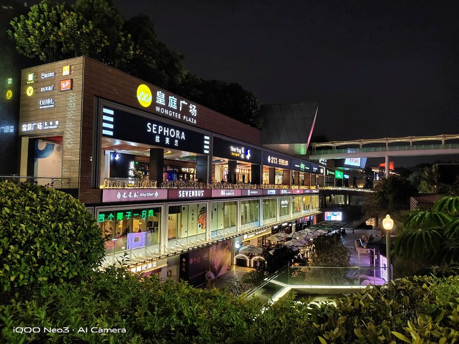 在夜景拍摄上,默认模式也能拥有不错的观感,即使在上面复杂的灯光环境下,画面整体曝光度控制得很自然,特别是高光部分压制到位。夜景模式通过暗部提亮带来更多暗部细节,提升画面整体效果。