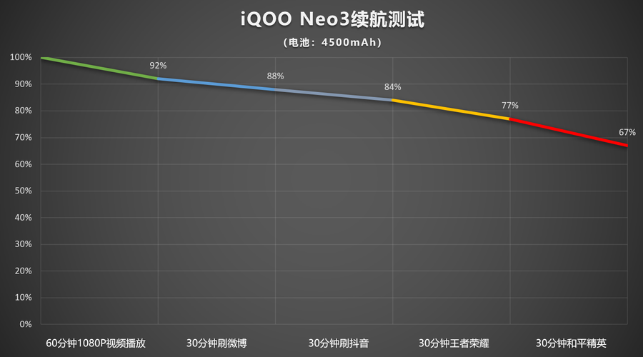 充电续航方面,iQOO Neo3配备了成熟的44W超快闪充,能够缩短充电时间,与之搭配的4500mAh大容量电池。