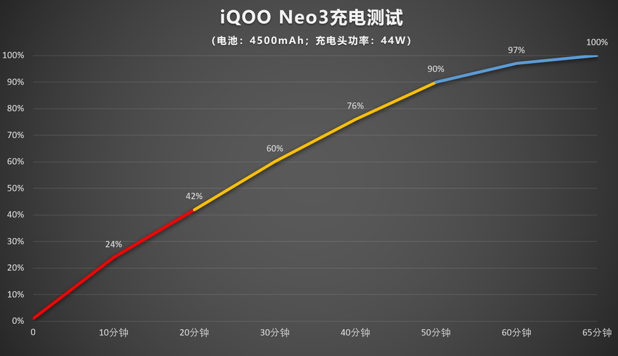 在电量仅剩1%的时候开始充电测试,只需10分钟即可达到24%的电量,30分钟可达42%的电量,达到100%的电量只需65分钟,对于配备了4500mAh大容量电池的手机来说,这样的充电速度已经比较出色,能够缩短日常充电等待时间。