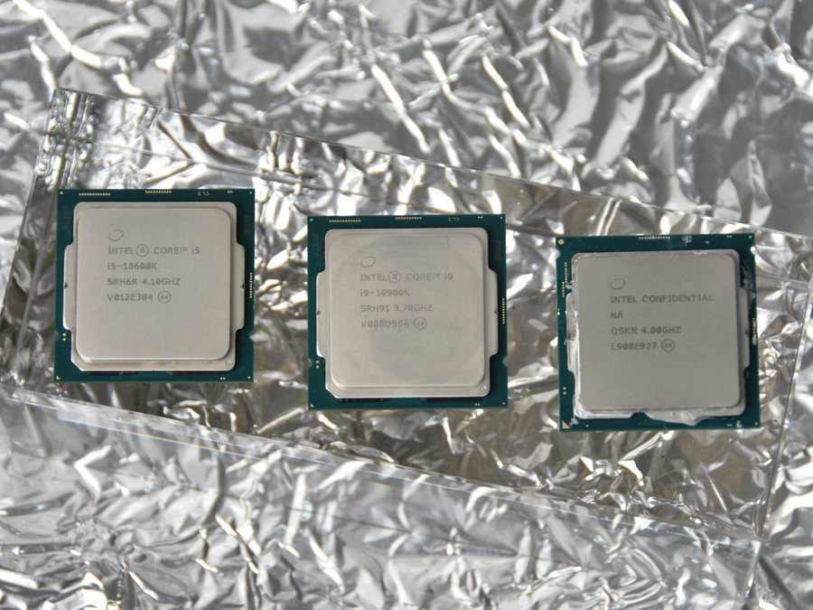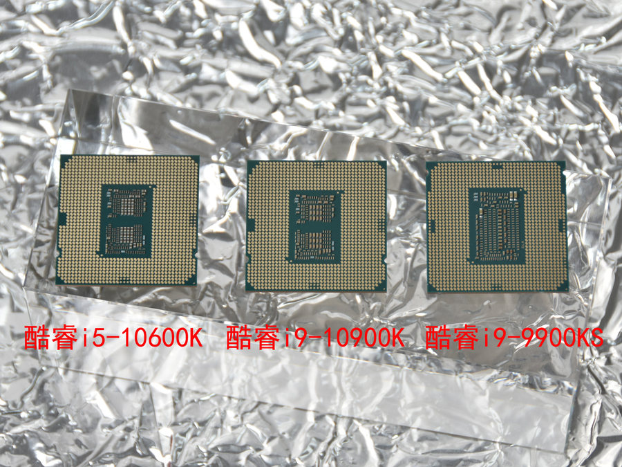 笔者将上一代旗舰酷睿i9-9900KS与酷睿i9-10900K、酷睿i5-10600K放在了一起,以便大家直观地了解第十代智能英特尔酷睿S系列处理器的外观变化。