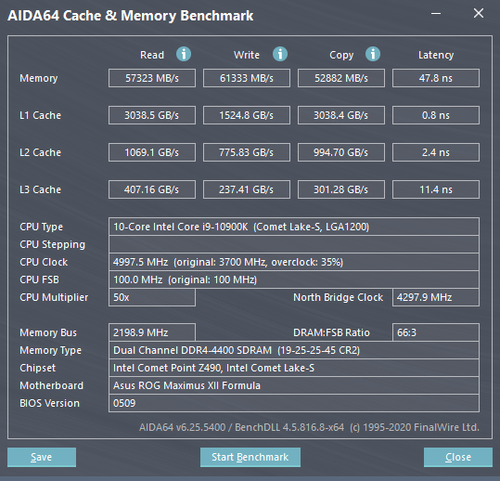 酷睿i9-10900K平台开启XMP模式之后,可以稳上DDR4-4400MHz的频率。