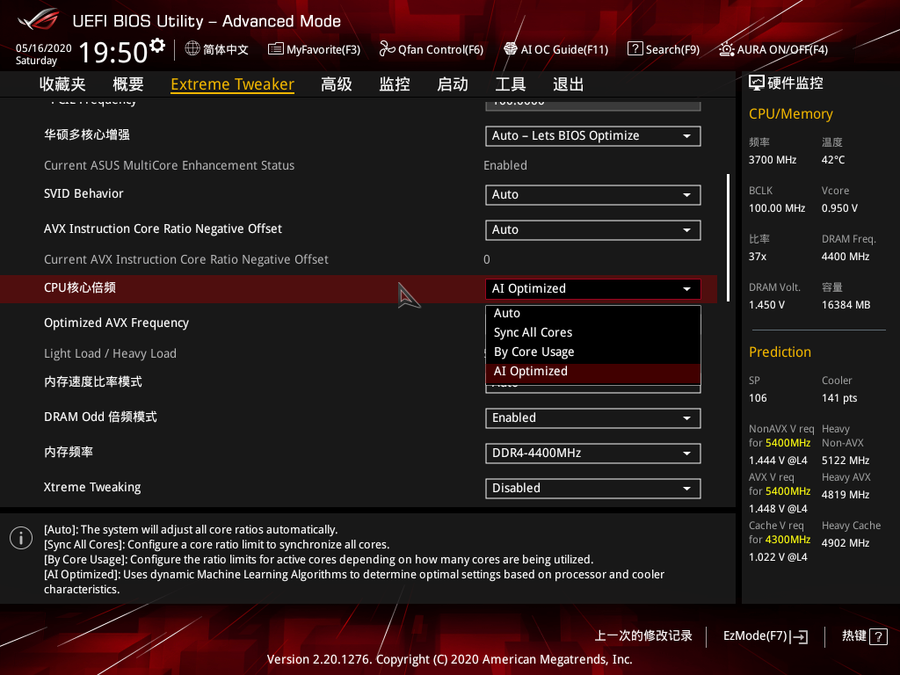 在主板BIOS中找到“CPU核心倍频”选项,然后选择“AI Optimized”设置,AI智能超频在系统重启后即可自动开启。