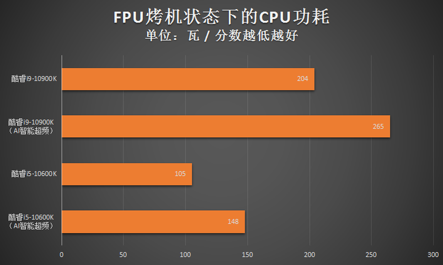测试小结:旗舰级的酷睿i9-10900K默认频率下的满载功率已超过了200W。而在开启了AI智能超频之后,其功耗更是高达265W。耗电量确实不小,大功率电源估计在未来一段时间内会很畅销。