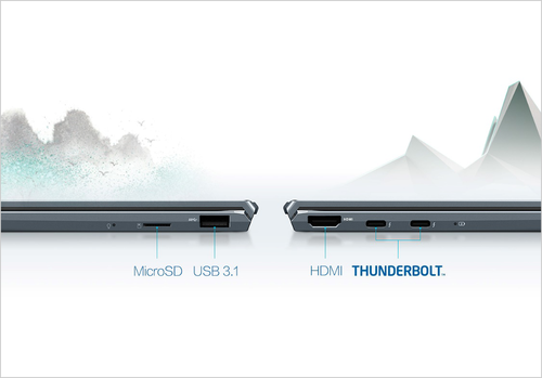 华硕灵耀14还为用户提供了与时俱进的I/O接口,其中包括全尺寸的HDMI 2.0及USB Type-A端口,还能体验双Thunderbolt 3(USB-C)接口带来的强大功能,高达40Gbps的数据传输相较传统USB 3.2 Gen 1接口快8倍,支持快速充电功能,还可连接4K UHD外接显示器和高性能扩展坞,轻松扩展桌面。