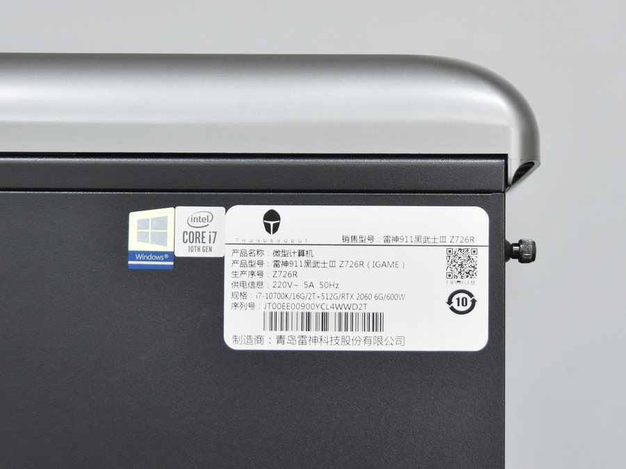 从右手侧盖我们可以发现,雷神911黑武士三代采用了Windows 10正版系统和英特尔第10代i7处理器,免安装工具的设计,省了不少力气。