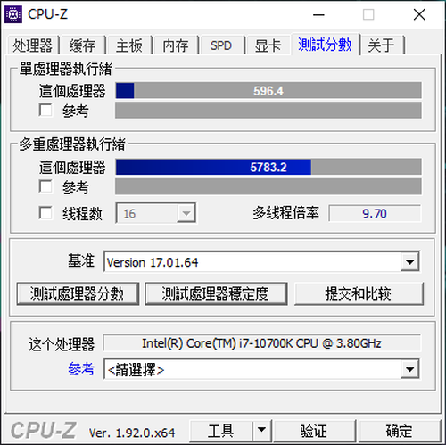 CPU-Z测试中表现优异,单核跑分数高达596.4,多核线程数跑分为5783.2.
