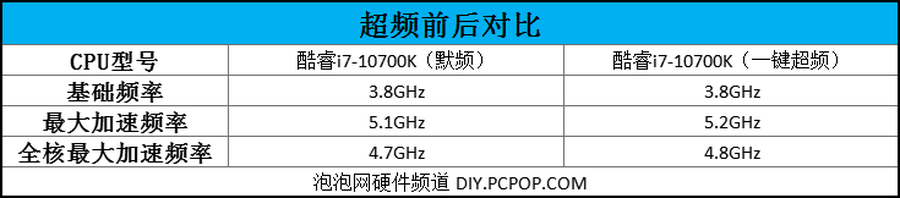 关于酷睿i7-10700k处理器加载一键超频的结果,笔者列出了一张频率对比表格。(CPU的详细频率可以利用HWiNFO这款软件识别。)