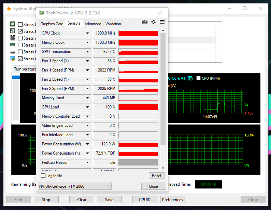 从测试来看,即使在在默认频率下的高压力烤机,显卡和CPU的满载温度分别为67摄氏度和74摄氏度,不影响实际体验,在小超过后,整体温度仍然没出现太大的涨幅,因为显卡风扇转速的提升和水冷散热的加持,从这里我们就体会到了分区散热设计的好处。