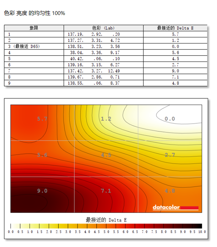 测试小结:在D65标准中,色温值为6500K表示色彩比较准确,不会出现偏冷或者偏暖。通过测试可知,这款显示器右上角区域(3号测试区域)最接近D65的标准。屏幕整个左下角区域(7号测试区域)偏差最大,差值为9.0。