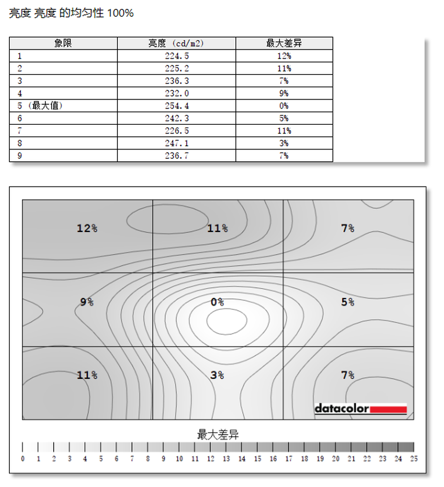 在亮度均匀性方面,这款显示器中心区域(5号测试区域)亮度高,达到了254.4cd/m2。它的左上角区域(1号测试区域)亮度偏差最大,差值达到了12%。