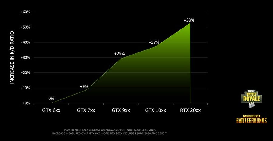 搭载 NVIDIA GeForce RTX 显卡的PC,其延迟比搭载 GeForce GTX 750 Ti 的PC低一半,比未搭载 GeForce GPU 的系统低近 6 倍。由此可知,通过升级 GPU 或其他可能限制 FPS 的组件来提升帧率是降低延迟的有效途径之一。帧能赢的另一个部分当然是“赢”,提高帧率降低延迟对战绩是否有直接影响,让我们往下看;