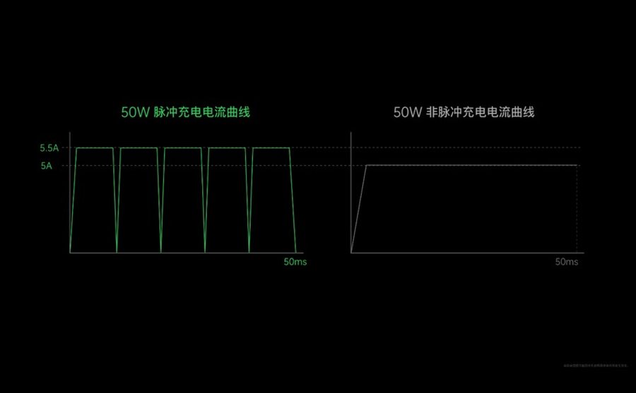 简单说就是OPPO干脆不储能了,而是采用脉冲充电的方式将50Hz的交流电转换成100Hz的直流电直接输给电池。脉冲充电是被验证过的对电池寿命更好的充电方式,此前在其他行业已经验证过了。OPPO先进将脉冲充电引入到手机领域,时间单位10ms,峰值电压10V,峰值电流5.5A,通过这种方式给电池充电,脉冲充电可以让电池充电效率更加线性。