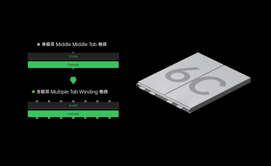 在电池端规格从3C提升到6C,电芯升级到充放倍率更高的双6C电芯,接受来自适配器的12.5A电流。电池工艺由极耳中置(MMT)升级为多极耳(MTW)工艺,电池的横截面的多极耳技术方案就像一个千层蛋糕,电芯的每一层都有正负极,电荷的运动路径成倍的缩短,电芯阻抗进一步降低就能允许高达12.5A的电流输入,有效降低电池充电时的发热。