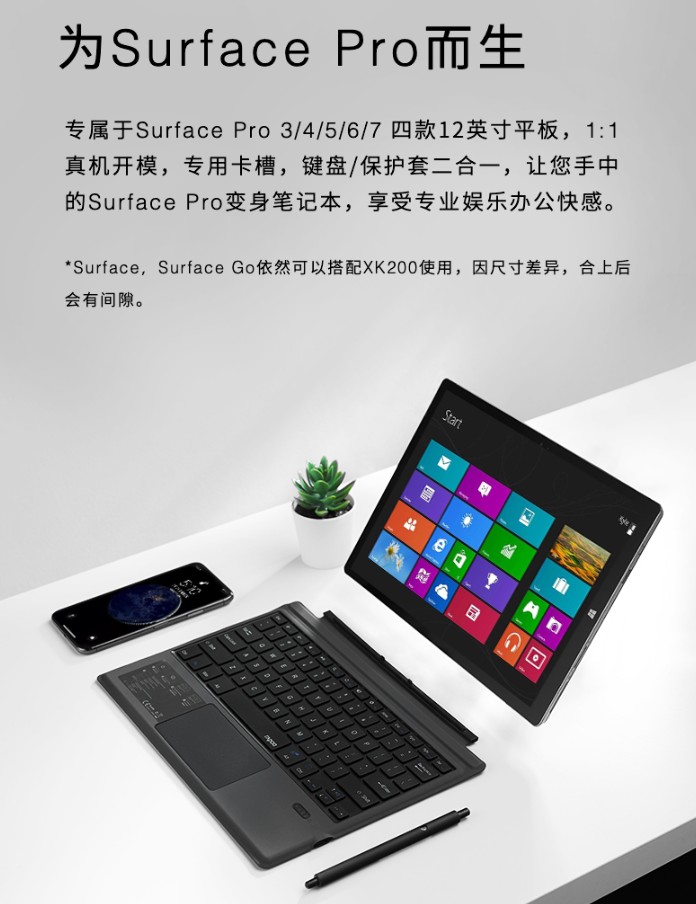 XK200采用真机开模,大小尺寸与Surface Pro3/4/5/6/7这几款12英寸平板优秀贴合,键盘上部设有专用卡槽,键盘/保护套二合一。
