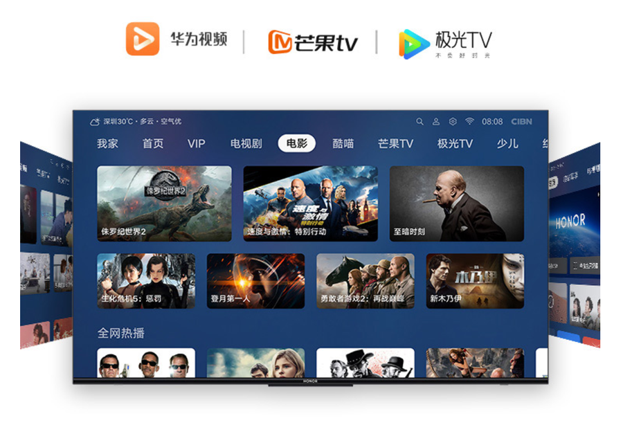 系统方面,荣耀智慧屏X1支持秒速开关机,内置华为视频、芒果TV、极光TV等丰富的资源平台,可以很容易找到热门影视资源。