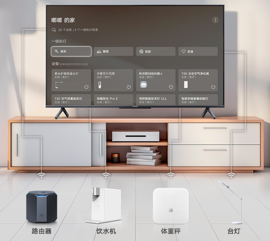 系统还支持HiLink智能家居生态产品互联,可以在电视上查看产品状态和控制智能家居产品,使用起来很方便。