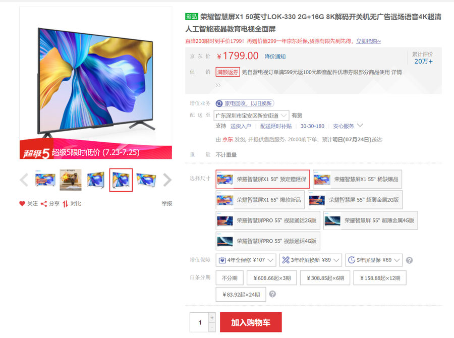 荣耀智慧屏X1 50英寸版本今天正式开售,原价1999元,首销优惠价只需1799元。优惠活动仅限今天,想要购买的朋友抓紧时间选购啦。