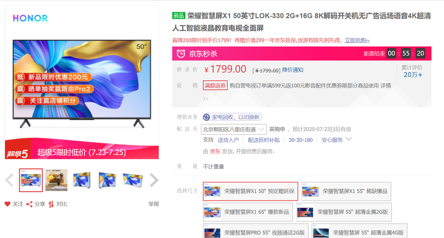 7月23日消息,荣耀智慧屏 X1 50英寸版今日10:08正式开售,首销优惠价仅为1799元。