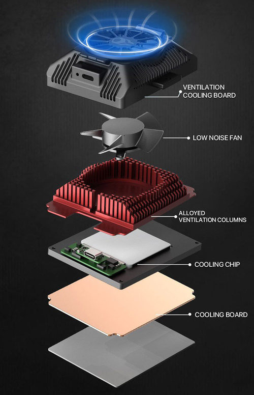 这个主动式散热器,除了基本的散热片,还设计有6200rpm的风扇。另外同时内置了制冷晶片,不但有效将热量带走,更可主动降低机身边的温度,效能较一般只有散热金属片和风扇的更佳。既是主动式散热系统当然是需要供电的,用户需另上以USB-C为其提供电量,至于电池方面用家就需要行思考如何加到散热器上了。