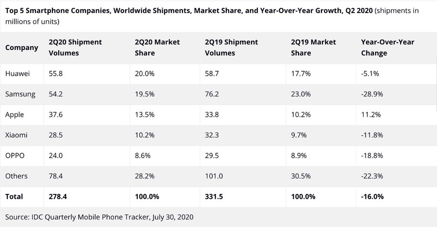 根据IDC公布的较新数据,2020年第二季度,全球智能手机出货量同比下降16%,总出货量为2.784亿。其中,OPPO以2400万的出货量稳居全球第五,约60%出货量在中国市场。