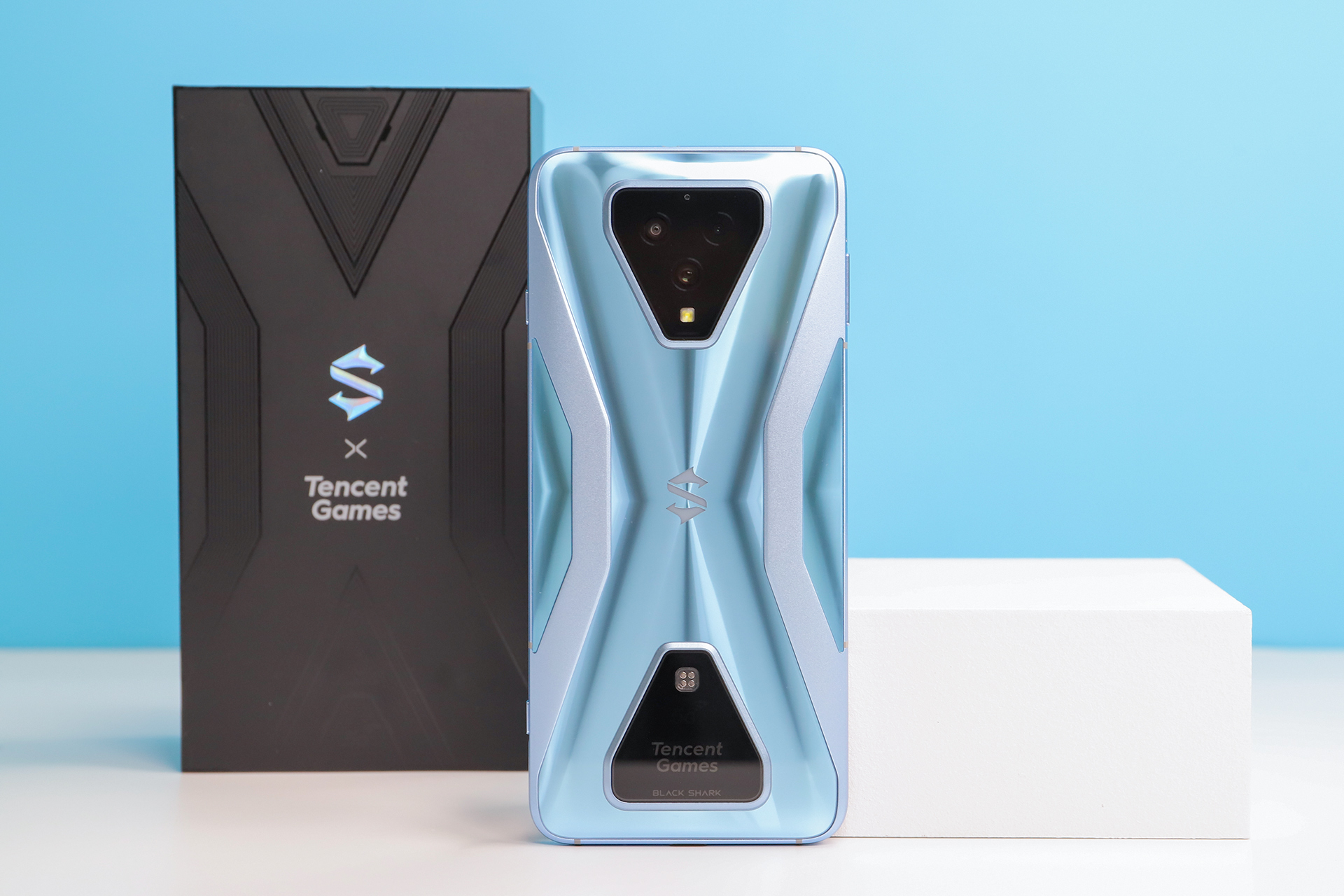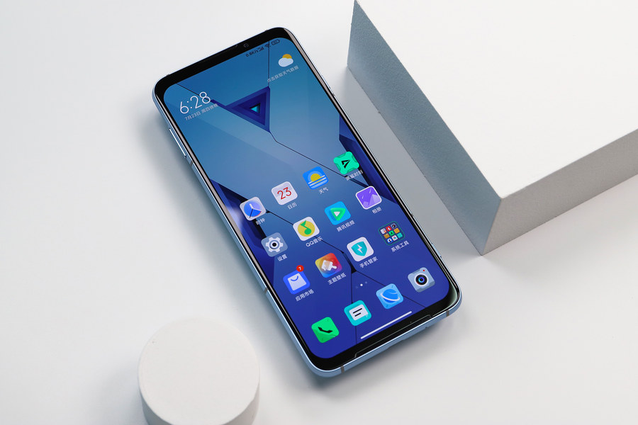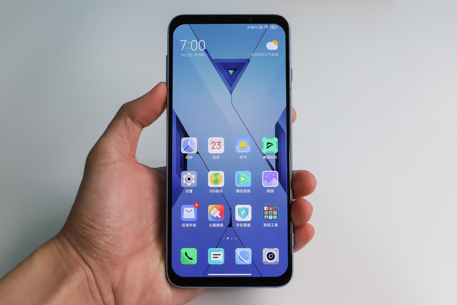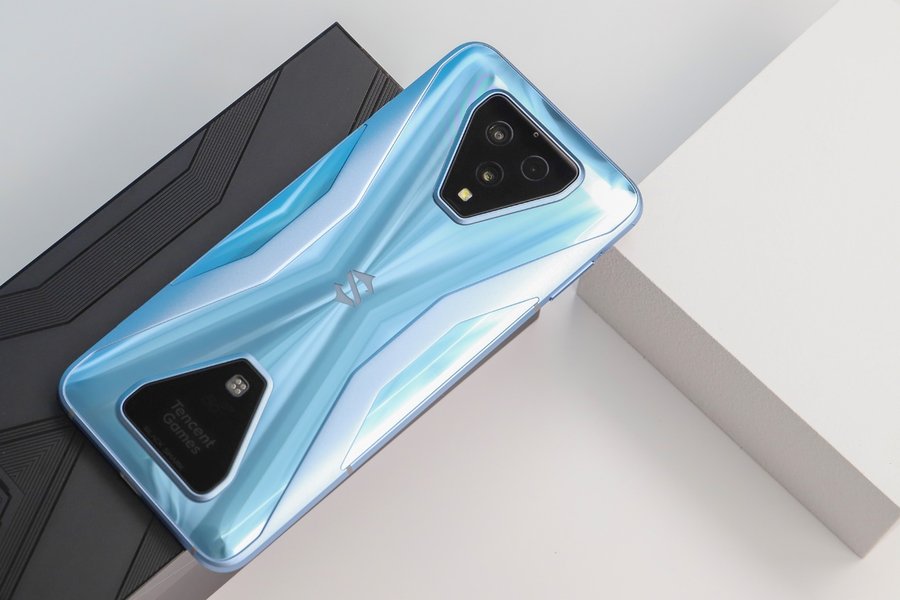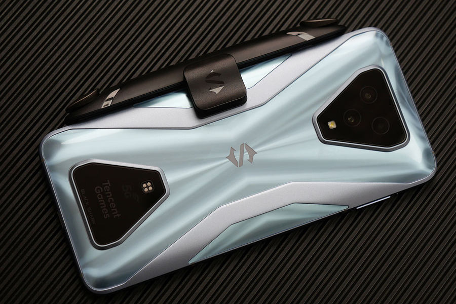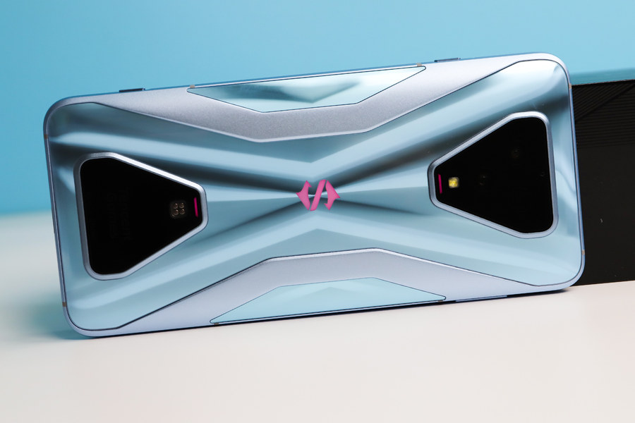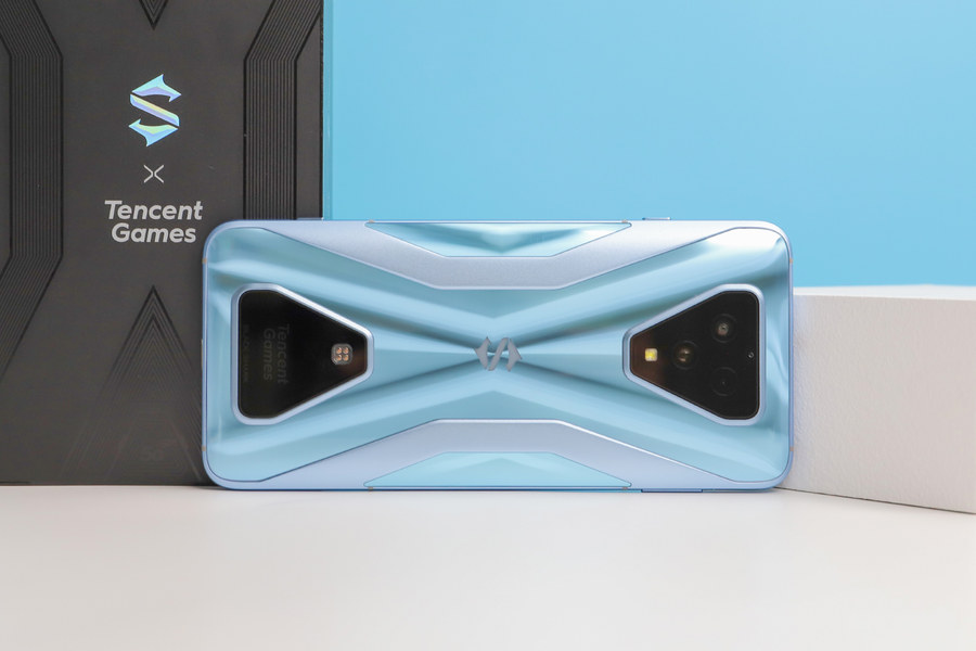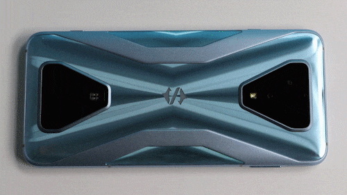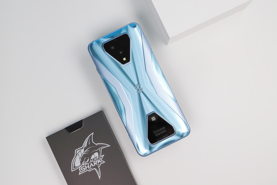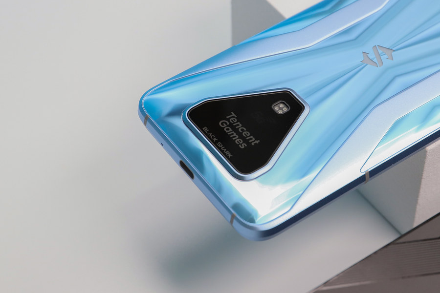 黑鲨3S拥有天云黑、水晶蓝两种配色,评测机为水晶蓝配色,这是一种淡淡的蓝色,机身背面的光影效果进行了重新设计。从不同角度看,可以看到灵动的光影效果。