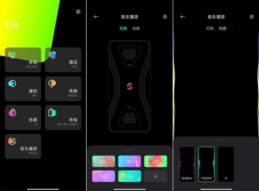 黑鲨3S背面配备了“S”形Logo等,背面的两个多边形模组上也都配备了一个小灯条,这三处灯光可以联动显示。在系统桌面自带了一个黑鲨之眼2.0灯光控制软件,可以自定义来电、充电、音乐播放等使用场景的灯光效果。