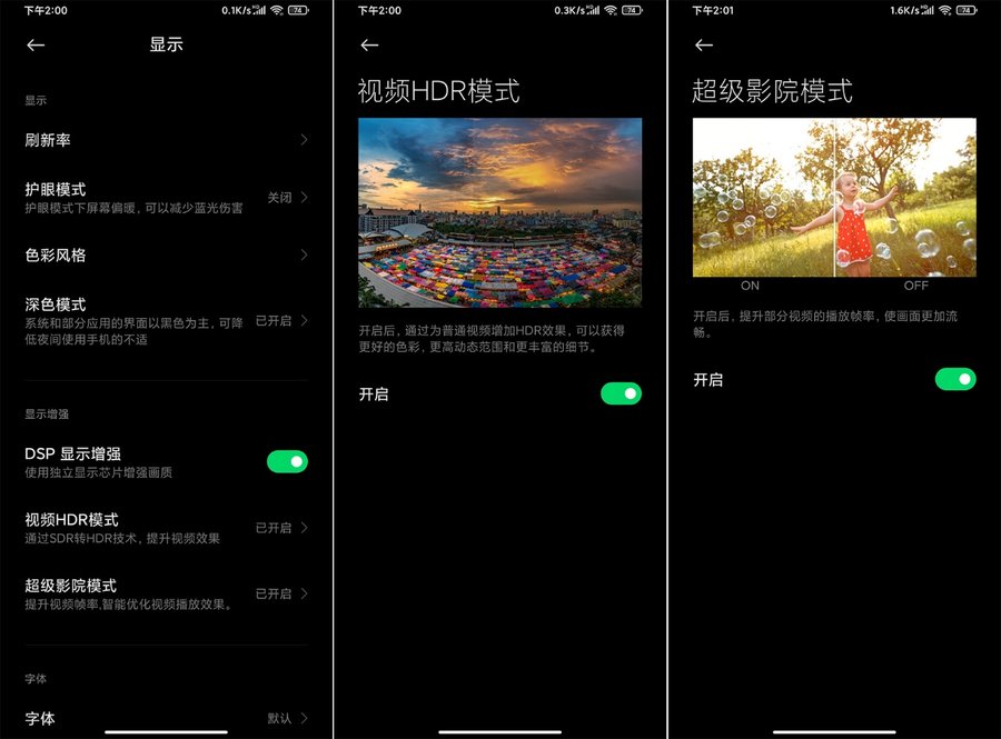 黑鲨3S的屏幕出厂经过调色,屏幕色准Delta E<1,屏幕色彩还原更加准确,实际屏幕色彩观感比较舒服自然,用户也可以在设置中选择不同的色彩模式。屏幕分辨率为2400×1080,通过了HDR 10+认证,支持独显DC调光,低亮度观看更舒适。