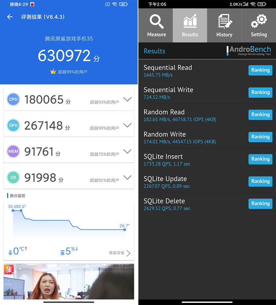 跑分方面,黑鲨3S安兔兔跑分高达63万+,这样的分数在目前旗舰机中都是很靠前的。