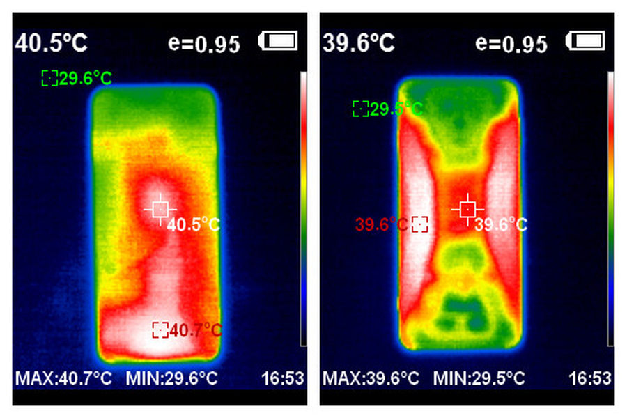 温度方面,玩游戏30分钟后,正面屏幕测得高温度为40.7°C,手机背面测得高温度为39.6°C。手机背面主要握持区域仍旧能够保证相对较低的温度,带来更加舒适的握持感。