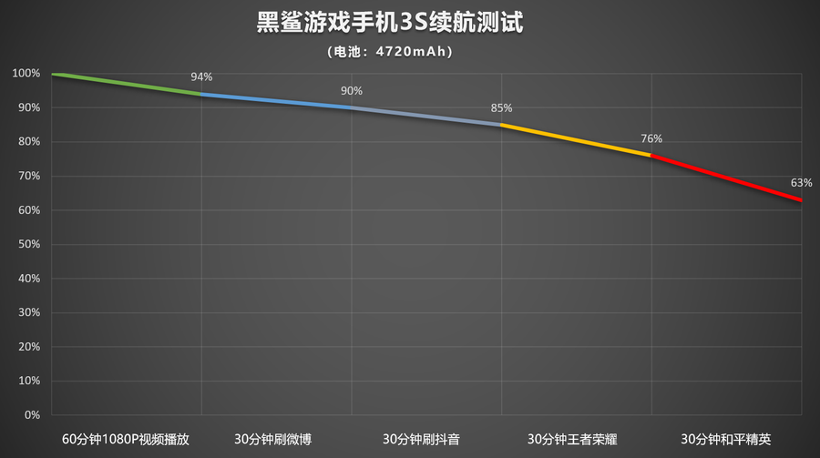 黑鲨3S配备了4720mAh大容量电池,业界首创串充并放双电池快充方案,根据不同使用状态智能切换,这种设计能够同时保证充电速度和续航能力。充电方面,配备了65W充电器。