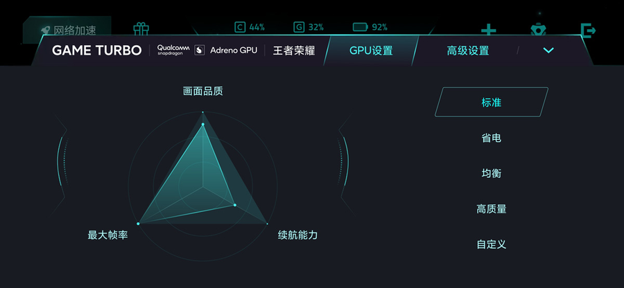 为了实现优秀的游戏体验,小米10至尊纪念版加入了GameTurbo 4.0,这项功能是专为玩家推出,可以针对不同的游戏,对GPU的性能进行调整,包括标准、省电、均衡、高品质、自定义五种选项。