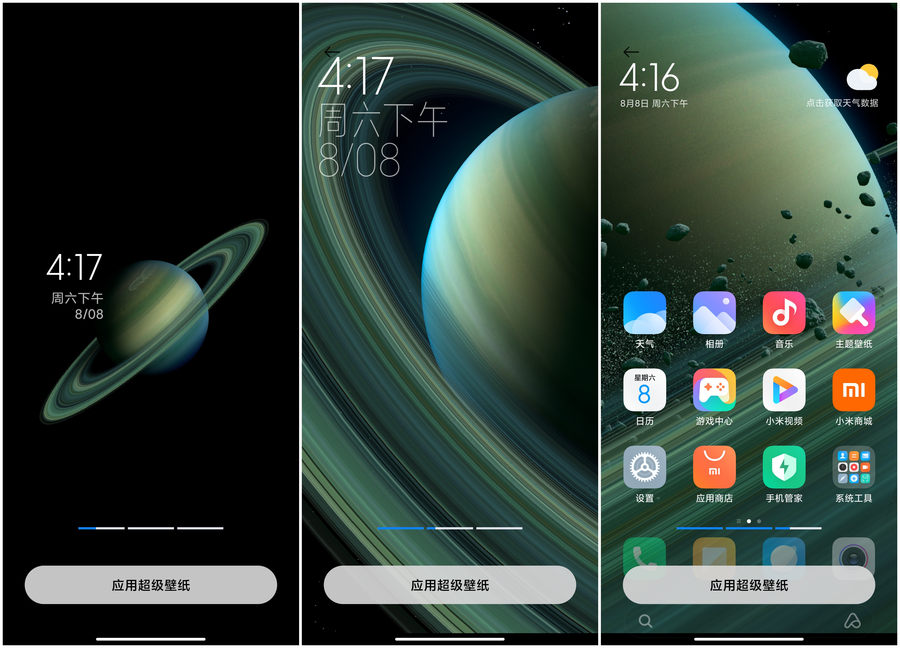 小米10至尊纪念版的MIUI 12也支持超级壁纸功能,相比目前的MIUI 12的超级壁纸,新增了土星环主题,依旧展示了超级壁纸细腻震撼的一面。