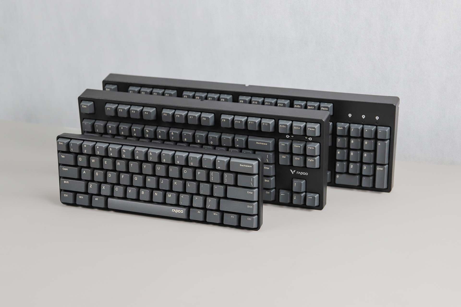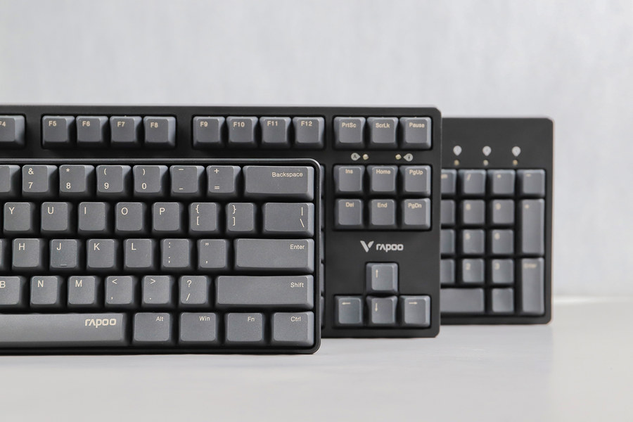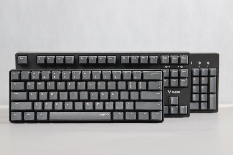 雷柏V860拥有104键、87键、61键三种按键布局,主要区别在于空间占用、对不同键位的取舍,覆盖到比较常见的按键布局,可以满足不同用户群体的需求,可以说你喜欢的布局它都有。