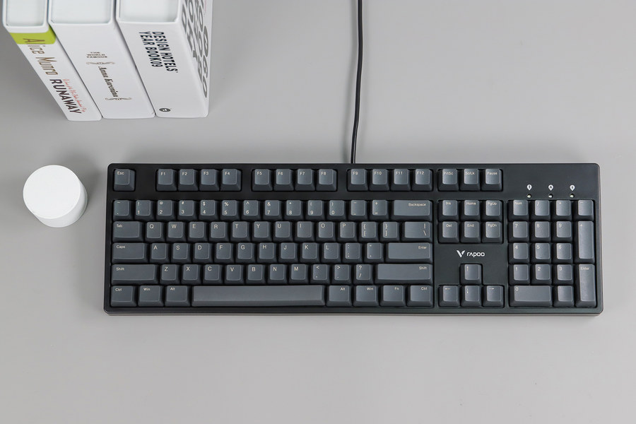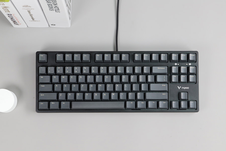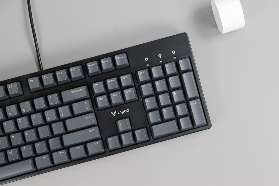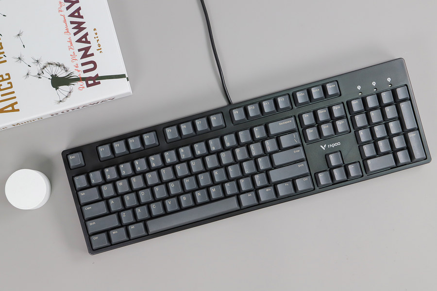 雷柏V860采用加厚PBT材质键帽,键帽为深灰色,看起来比较有格调,与常见的黑色按键不同。键帽表面为磨砂质感,可以带来细腻的触感,不容易打油。加厚键帽质感好,手指触感舒适。