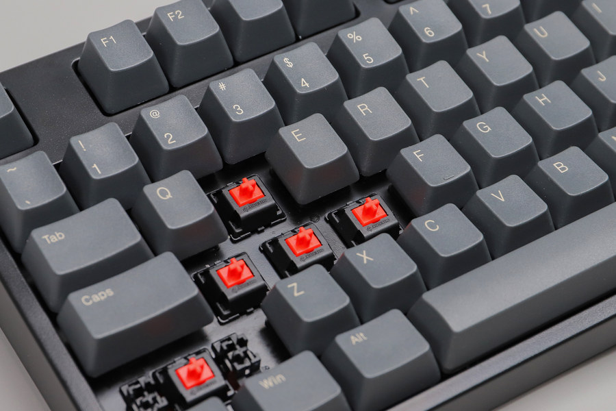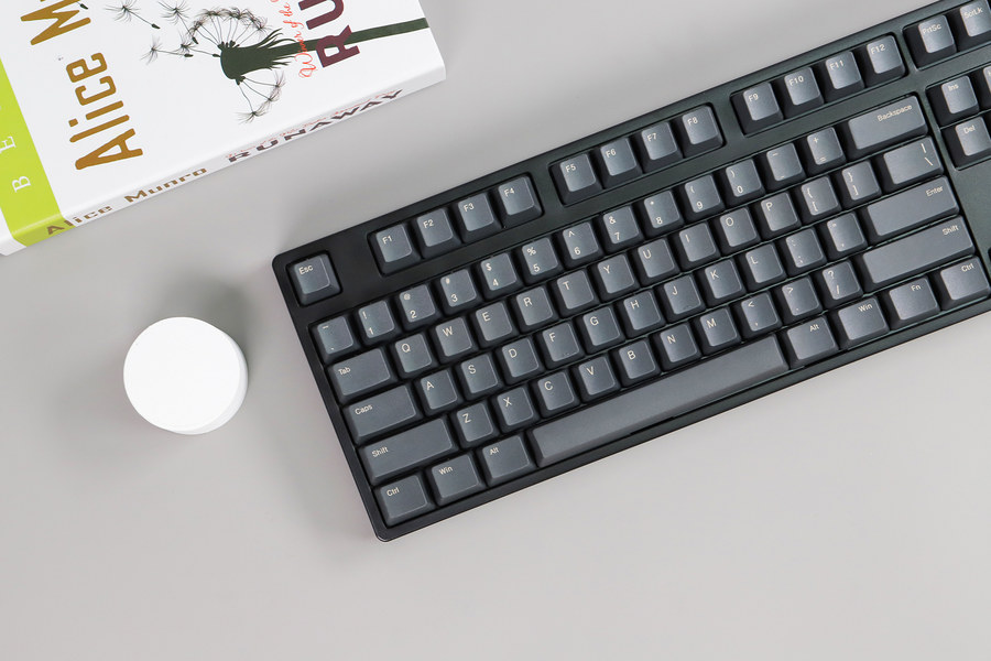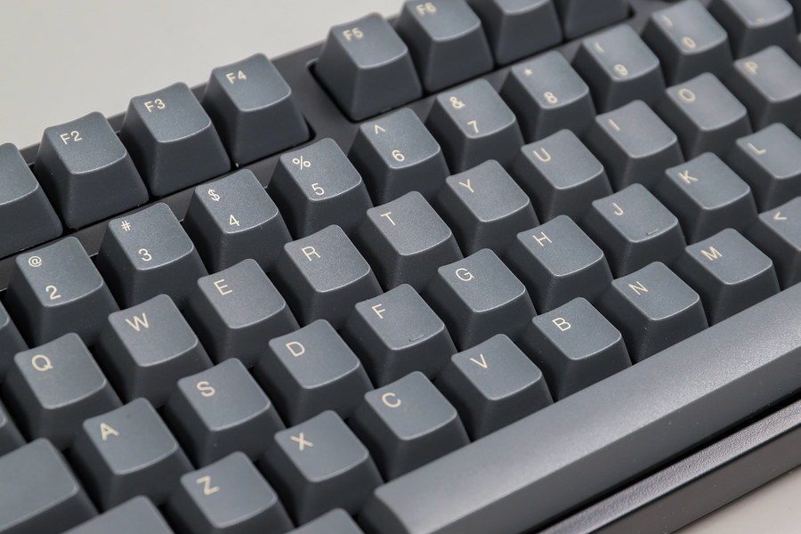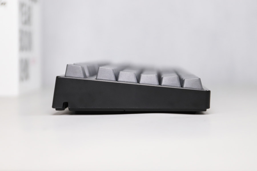 键帽采用镭雕技术字符,字符为灰白色,字体清晰锐利,字体比较纤细。灰白色的镭雕字体搭配深灰色键帽,视觉效果和谐统一。